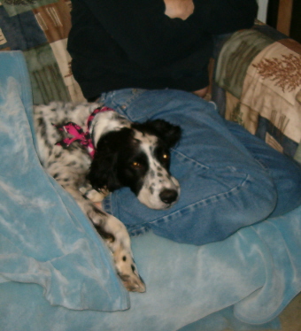 He slept last night in the spare bedroom with our other 3 Setter girls, just like he had been doing it all his life. Took him down to the lake this afternoon for his first leash walk. He was GREAT!! Walked with the rest of them like a pro. He is very interested in birds and responds immediately to Mike's whistle, so Mike thinks he might have hunted sometime in a former life. He already seems to love his Setter sisters, and they love him too. Even Gracie, our little (sometimes) pain-in-butt girl was playing with him this afternoon!!